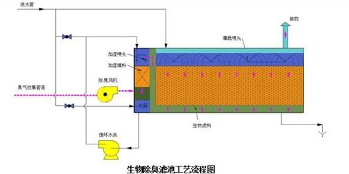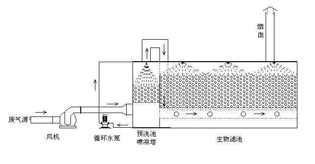 惡臭氣體收集裝置→預(yù)處理裝置→生物過(guò)濾裝置→抽風(fēng)機(jī)→達(dá)標(biāo)排放