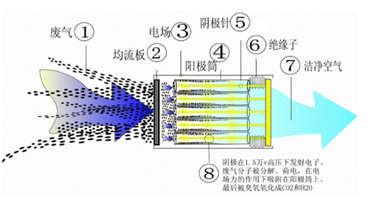 至5000萬(wàn)次的速度反復(fù)轟擊廢氣的分子,去激活、電離、裂解廢氣中的各種成份,從而發(fā)生氧化等一系列復(fù)雜的物理化學(xué)反應(yīng),在平均能量約5eV的大量電子作用下,使通過(guò)凈化器的廢氣分子轉(zhuǎn)化成各種活性粒子,與空氣中的O2結(jié)合生成H2O、CO2等低分子無(wú)害物質(zhì),采用高壓發(fā)生器形成低溫等離子體,使廢氣得到凈化。