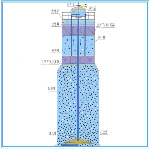 IC反應(yīng)器具有很大的高徑比,一般可達(dá)4-8,反應(yīng)器的高度達(dá)到20m左右。整個(gè)反應(yīng)器由第 一厭氧反應(yīng)室和第 二厭氧反應(yīng)室疊加而成。每個(gè)厭氧反應(yīng)室的頂部各設(shè)一個(gè)氣、固、液三相分離器。第 一 級(jí)三相分離器主要分離沼氣和水,第 二級(jí)三相分離器主要分離污泥和水,進(jìn)水和回流污泥在第 一厭氧反應(yīng)室進(jìn)行混合。第 一反應(yīng)室有很大的去除有 機(jī)能力,進(jìn)入第 二厭氧反應(yīng)室的廢水可繼續(xù)進(jìn)行處理,去除廢水中的剩余有 機(jī)物,提高出水水質(zhì)。