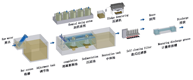 盤片在單元內(nèi)為緊密壓實(shí)疊加在一起,上下兩層盤片中間溝槽起到過濾攔截的作用。自清洗過濾器出水即達(dá)到回用或排放標(biāo)準(zhǔn)。沉淀池中的污泥,經(jīng)收集進(jìn)入污泥濃縮池,由污泥泵提升進(jìn)入污泥脫水機(jī)房進(jìn)行濃縮脫水, 脫水后的泥餅定期外運(yùn)處理。
