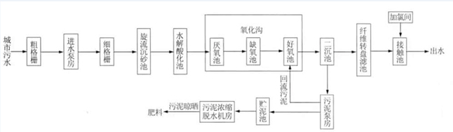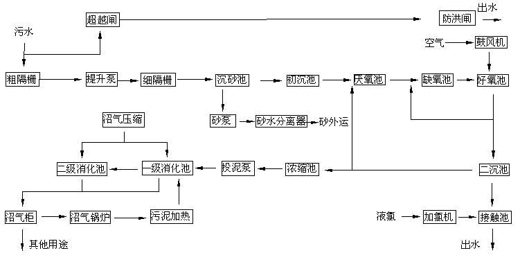 進(jìn)水→沉淀池→厭氧消化池→厭氧生物濾池→拔風(fēng)管→氧化溝→進(jìn)氣出水井→排水。