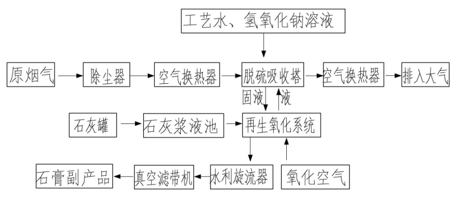 煙氣經(jīng)脫硫塔凈化吸收后由煙囪排放,SO2與其中一堿NaOH生成Na2SO3,繼續(xù)吸收SO2時(shí),吸收劑中的Na2SO3吸收SO2后轉(zhuǎn)化為NaHSO3,這時(shí)須在中和槽中用Ca(OH)2或CaCO3進(jìn)行還原處理,生成Na2SO3和不溶性的半水亞硫酸鈣。半水亞硫酸鈣在沉降池沉積,上清液返回吸收系統(tǒng),沉積的半水亞硫酸鈣堆積到一定程度后集中處理,也可經(jīng)氧化后制成石膏或作為無(wú)害物拋棄填埋。再生后所得到的NaOH和NaSO3都對(duì)煙氣中的有害物質(zhì)有較好的吸收作用,可送回吸收系統(tǒng)循環(huán)使用。