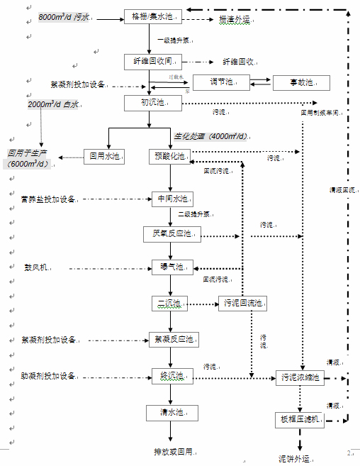 各車間、工段生產廢水經初次撈漿后,輸送至格柵渠,在此撈除大塊的浮渣后進入集水池。廢水經集水池內的提升泵提升到纖維回收間進一步去除懸浮物、實現漿回收,同時為后續(xù)的生化處理系統(tǒng)創(chuàng)造條件。廢水經過纖維回收設備后自流到初沉池,去除水中的絕大部分懸浮物,以確保回用水的回用水質,在初沉池后廢水回用至生產車間,同時白水也直接回用;其余的的廢水進入下一個污水處理工段;